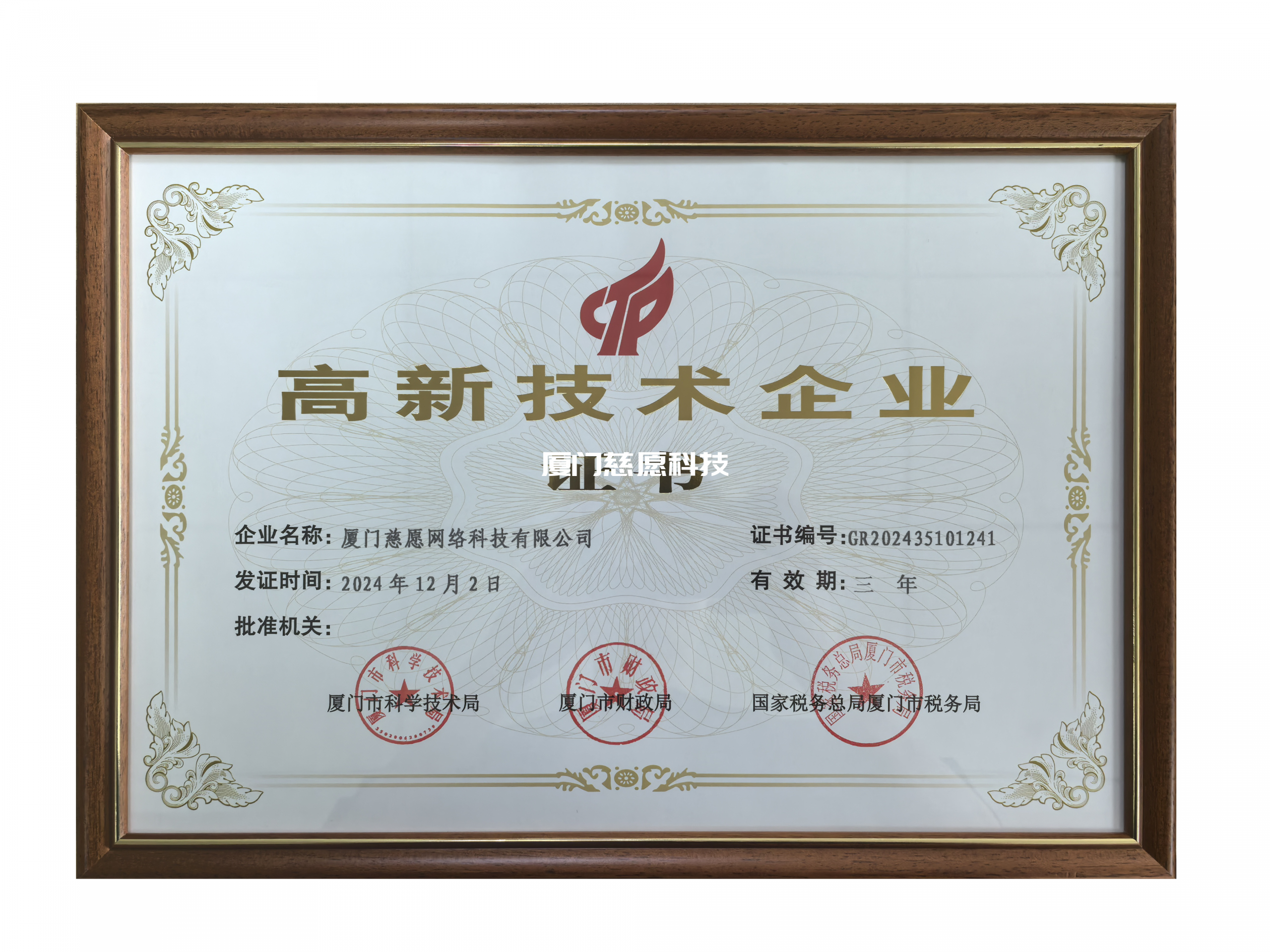近日,全国高新技术企业认定管理工作领导小组办公室发布《对厦门市认定机构2024年认定报备的第二批高新技术企业进行备案的公告》,厦门慈愿网络科技有限公司,荣获2024年”高新技术企业”称号。